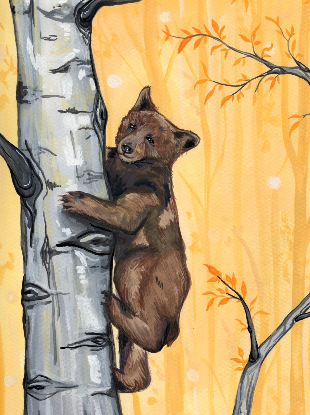 Original painting of a bear cub in a tree.