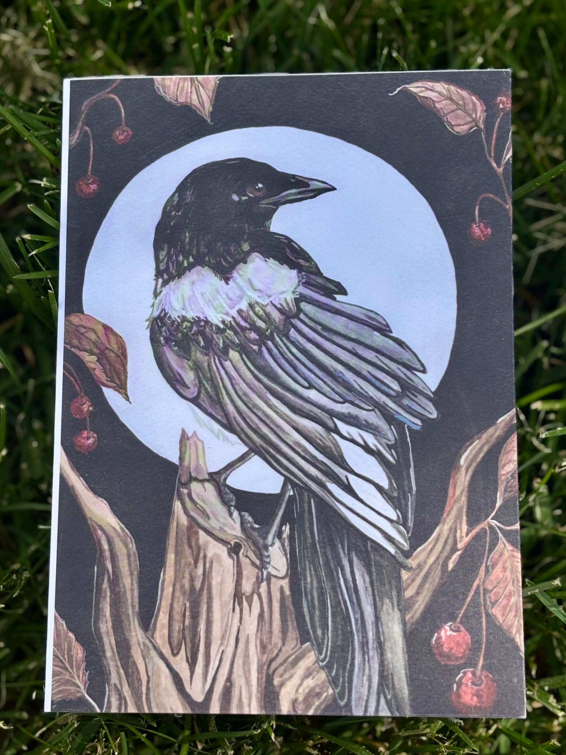This 5x7" card features a magpie. Card comes with white envelope and is thick cardstock. Inside is blank.