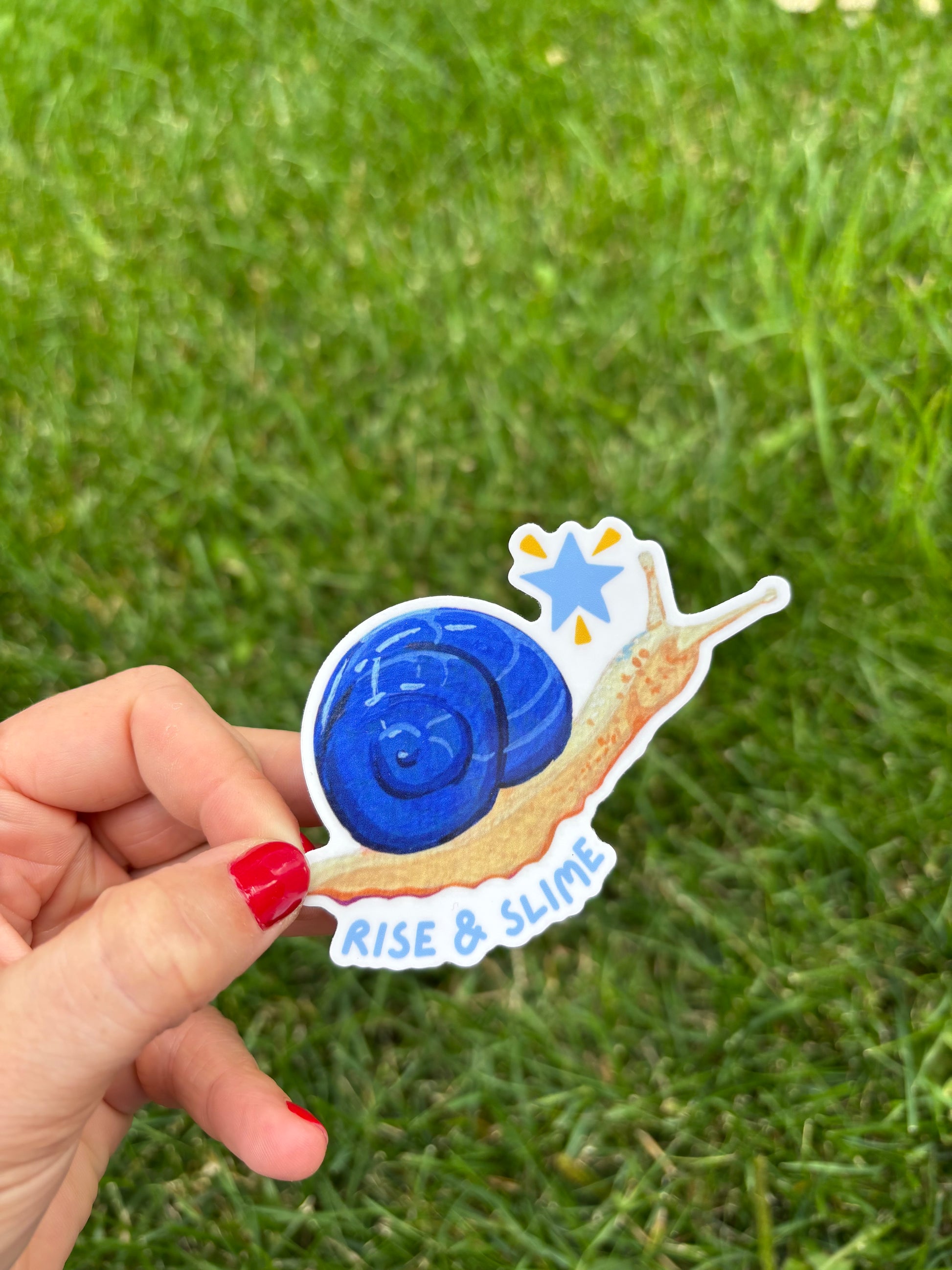 A glossy sticker of a snail with the text "rise & slime." Sticker is aproximately 3x3."