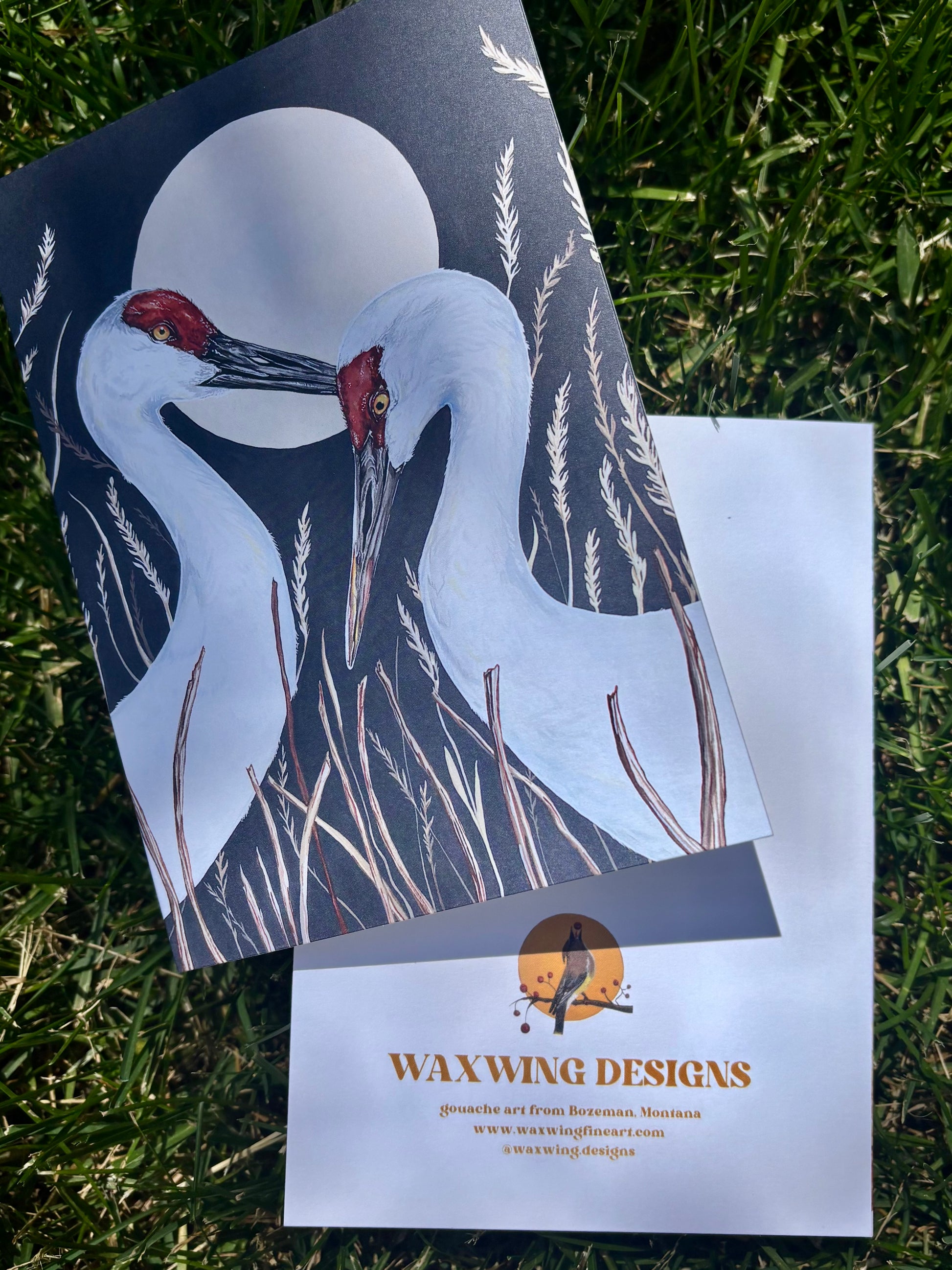 This 5x7" card features two sandhill cranes. Card comes with white envelope and is thick cardstock. Inside is blank.