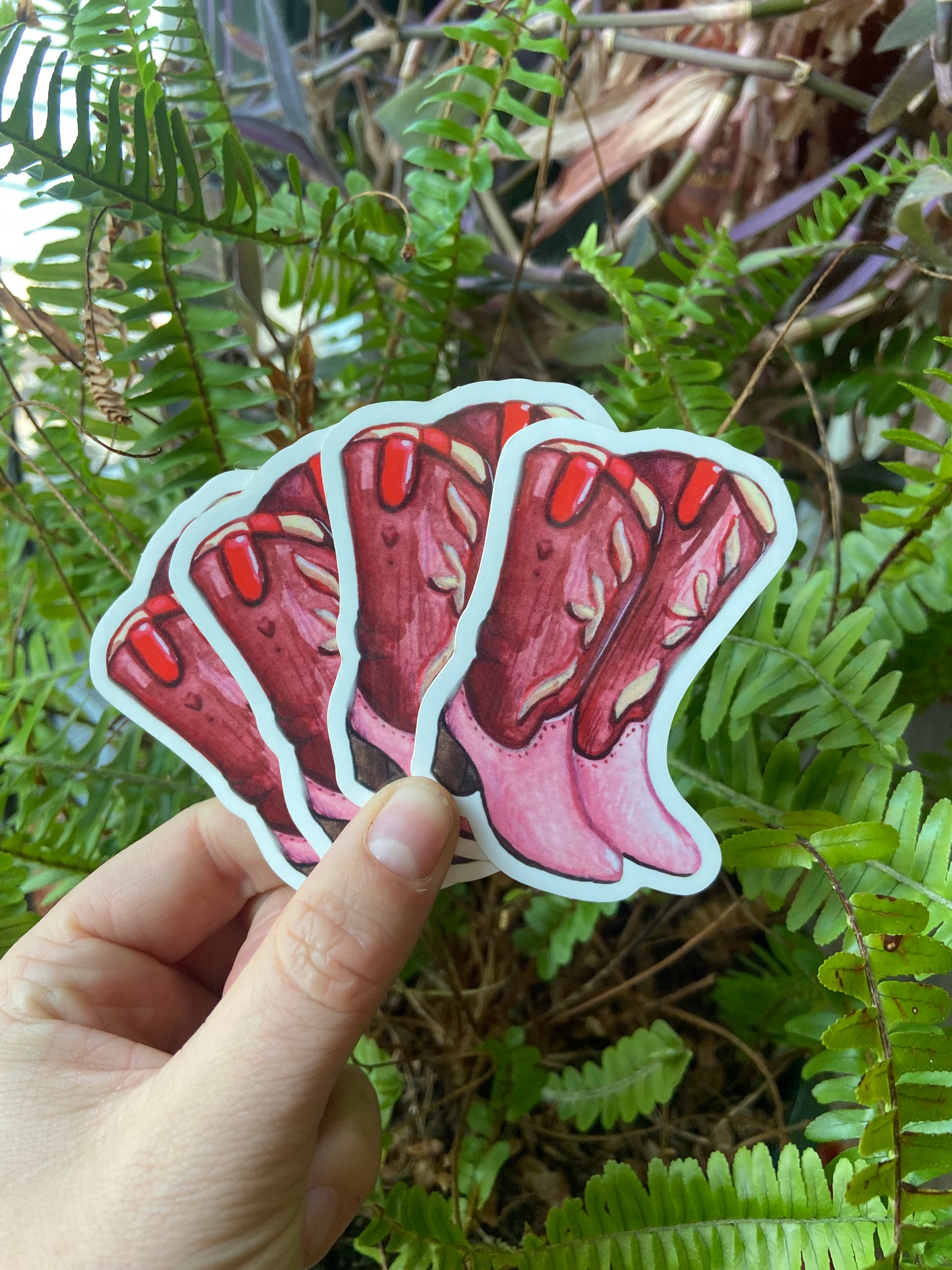 A glossy sticker of pink boots. Sticker is die-cut. Dimensions are 2.39" by 3"