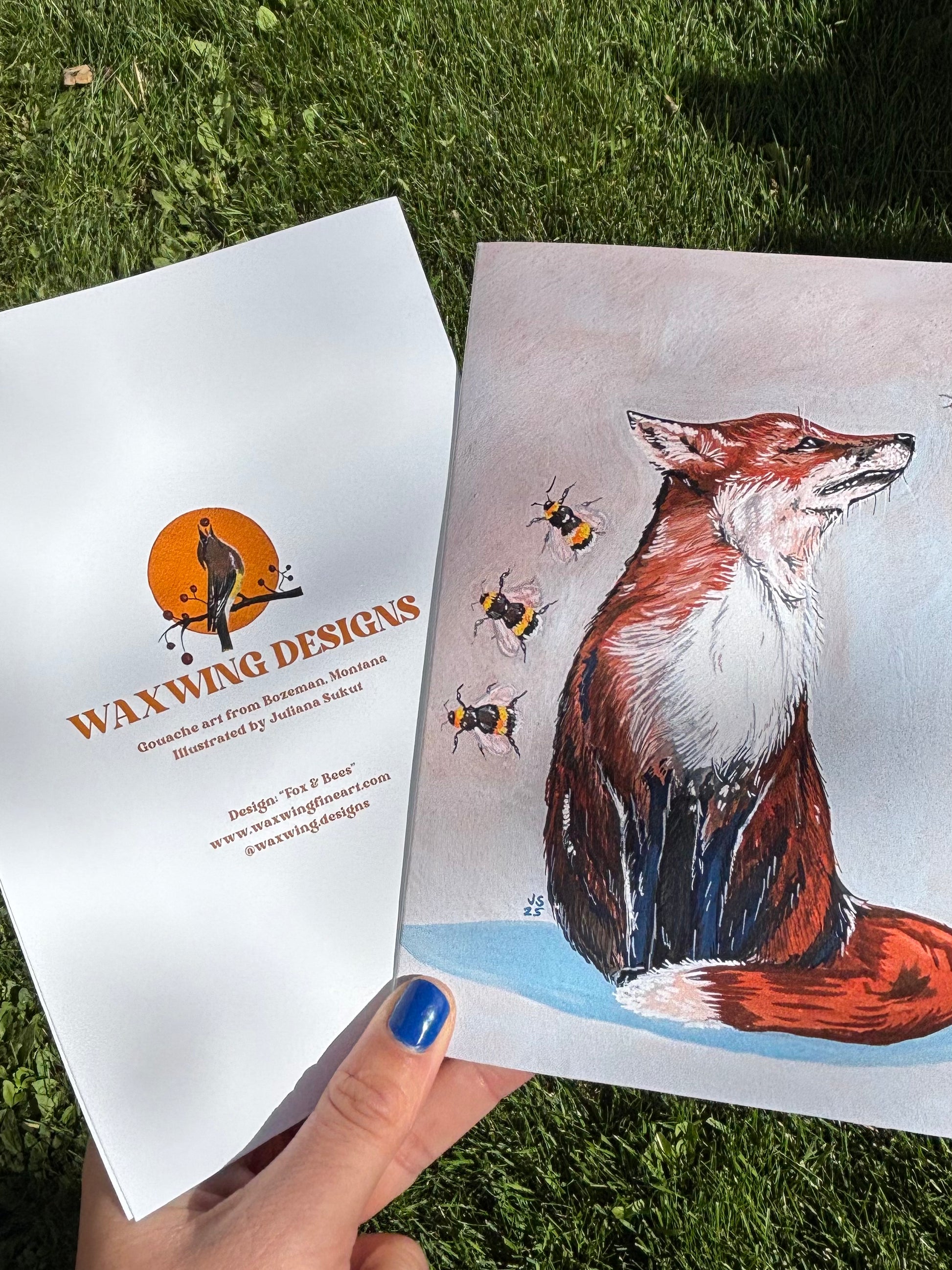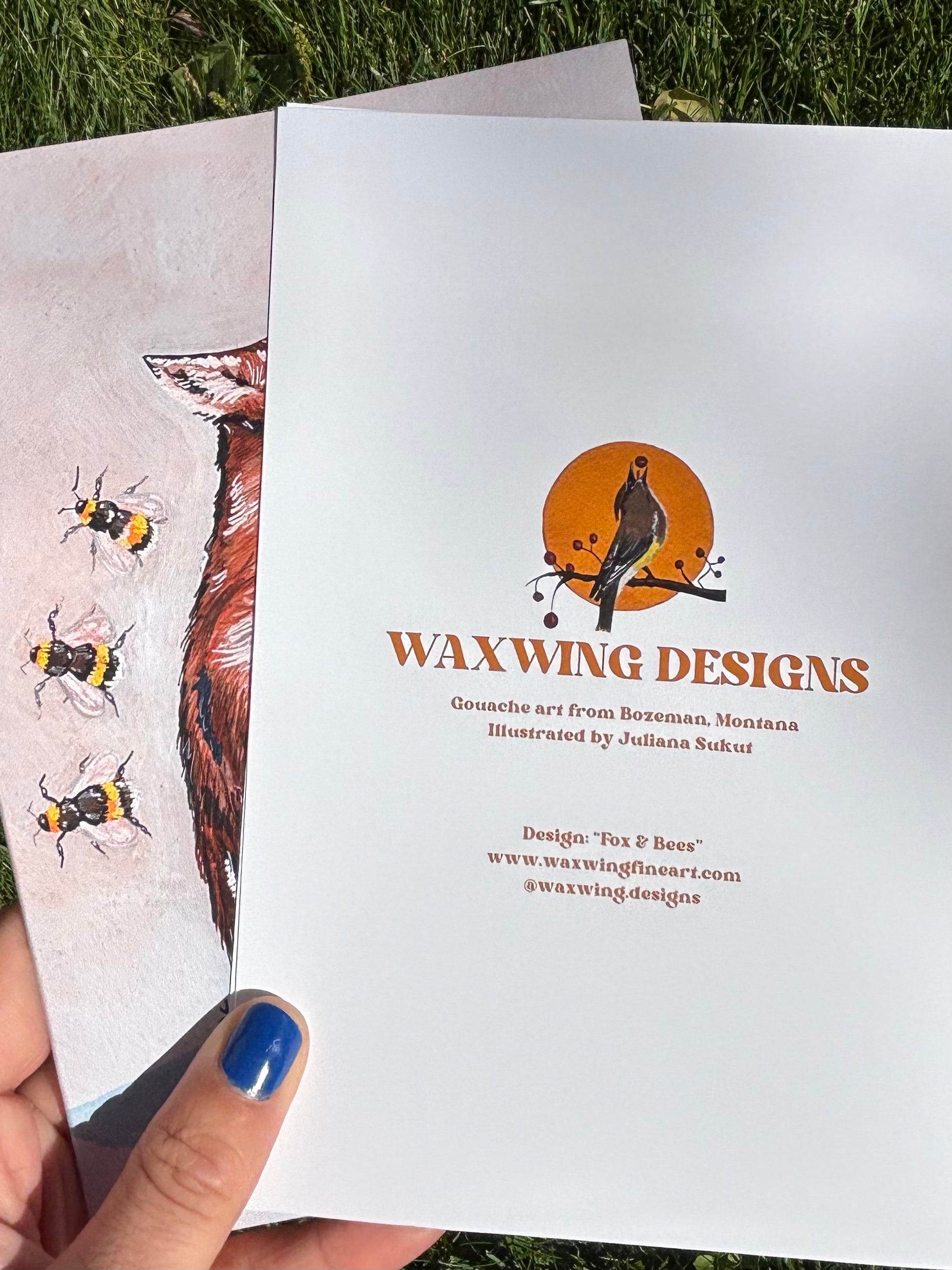 This 5x7" card features a Fox and Bees. Card comes with white envelope and is 60 lb cardstock. Inside is blank. Back has logo and card information.