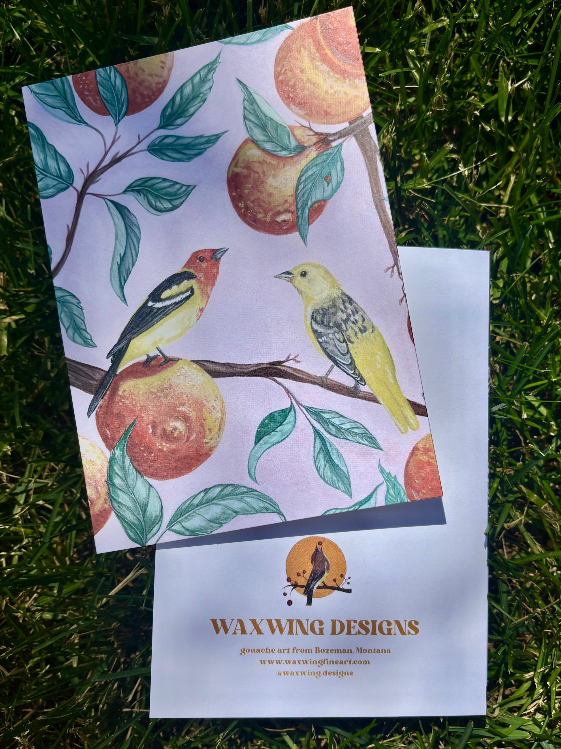 This 5x7" card features two Western Tanagers. Card comes with white envelope and is thick cardstock. Inside is blank.