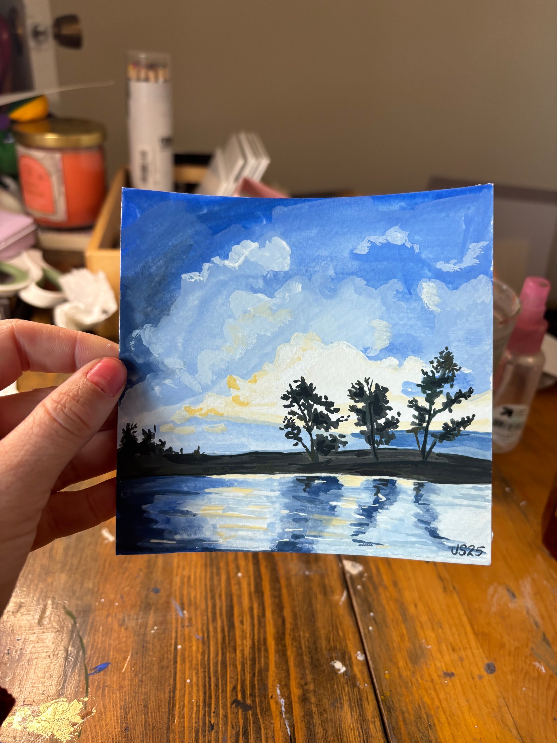 5x5” original gouache landscape painting of the Yellowstone River. Painting is gouache on cold pressed watercolor paper by Juliana Sukut 2024.